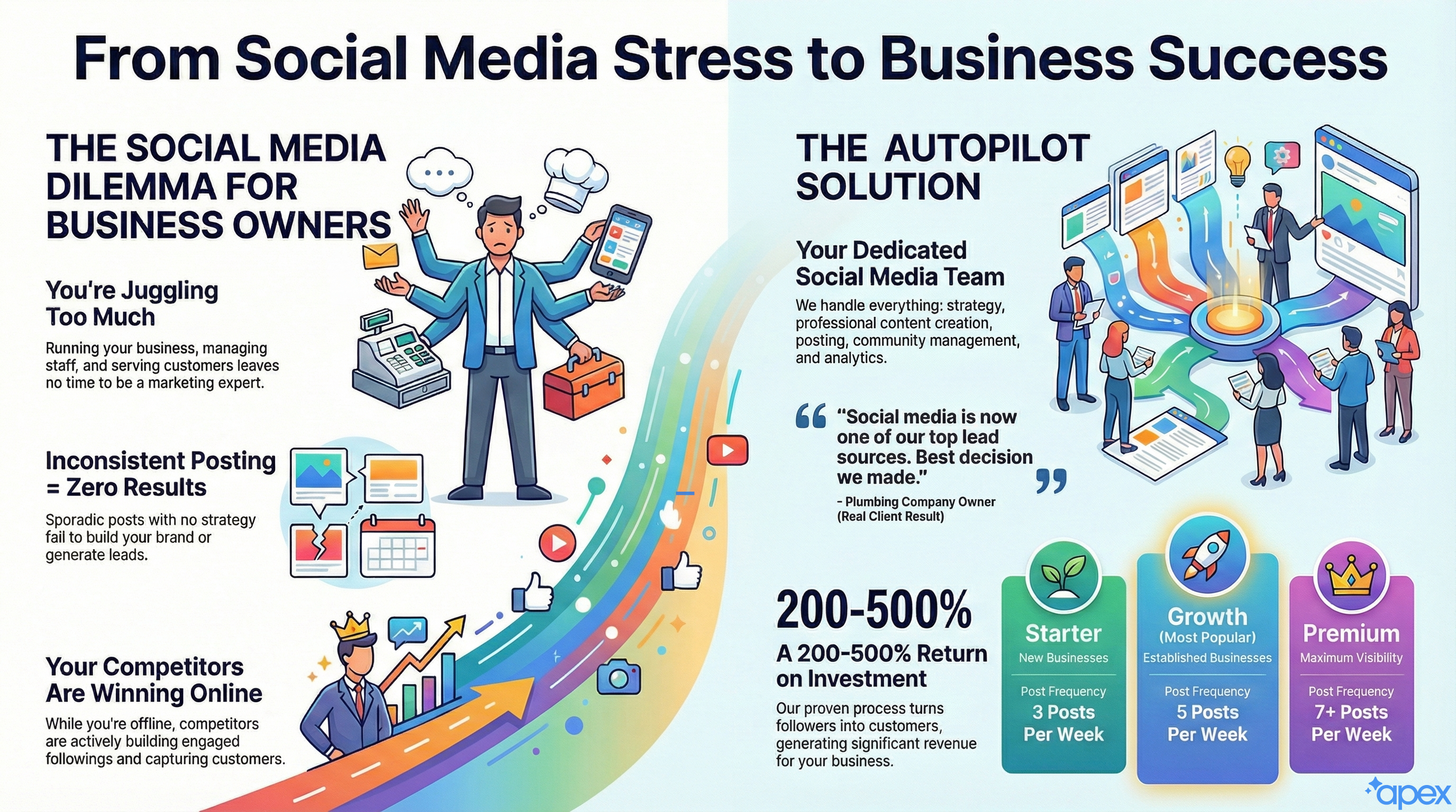 "I tried doing social media myself for years and got nowhere. Three months after hiring Apex, customers were calling and saying 'I've been following you on Facebook!' Now social media is one of our top lead sources. Best decision we made."